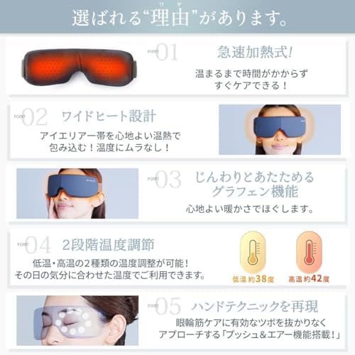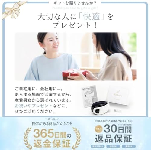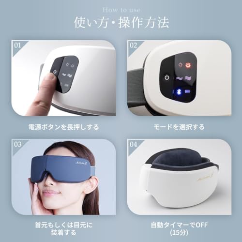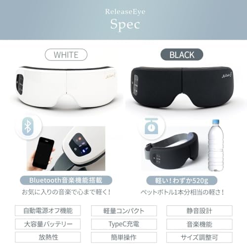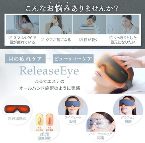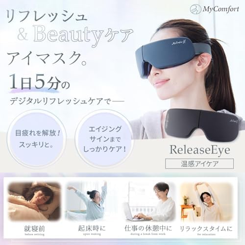 【目の美容院監修のWケアモデル】「広範囲のあたため」と「部位毎のもみほぐし」を実現したMyComfort(マイコンフォート)のリリースアイ。[あたため機能] ヒーティングエリアを広範囲に設けることで、首元・目元をしっかり温めることが可能に。また、耐久性と保温性に優れた”グラフェン加熱方式”を採用し、温かさを身体に浸透させます。低温・高温の2つの温熱パターンを用意しているので、お好みに合わせて選択が可能です。 [もみほぐし機能] 目元とこめかみ部分で独立したエアバッグが最適な圧力で心ゆくまでもみほぐしを行います。あたため機能と合わせて使用することも単独でもみほぐすことも可能で、最大6パターンの使用方法でお楽しみいただけます。【こんな方にオススメ】目元周りが気になる…。スマホやPC作業を長時間している…。自宅で手軽に目元周りのケアしたい…。プロレベルの目元ケアを試してみたい…。目の美容院が監修したリリースアイで今すぐ極上の目元ケアをお楽しみください。 【首元からの目元ケア】 ”目の美容院”監修の元、首元にある天柱(てんちゅう)という”眼筋のツボ”を最初に温めます(5〜6分程)。その後、目元周りに装着し、あたため機能(及びもみほぐし機能)を使用することで、圧倒的な快適さを実現できます。目元周りを温めた後はお持ちのタオル等で目元を冷やし、温かさを閉じ込めることで、更なる心地よさをもたらします。目のスペシャリストが提唱する首元からの目元ケアを是非、お試しください。※首元からのケアは必須ではございません。目元だけのケアとしてお使いいただくことももちろん可能です。 【リリースアイが選ばれる理由!】目元ケアのスペシャリストである”目の美容院”が監修したリリースアイ。目元ケアには「首元」ケアが大切であることを前提に『首元から創り出す目元ケア』を提唱頂きました。目の美容院と本気で考えたMyComfortのリリースアイがあなたの生活に圧倒的な快適さ・心地よさをもたらします。業界最新のワイドヒーター設計と部位毎に独立したエアバッグが頭部〜目元をしっかりもみほぐし圧倒的な心地よさを実現いたします。Bluetooth音楽機能も搭載しているため、音楽を流しながらおうちで楽しむことができます。就寝前やお仕事の合間、おうち時間に是非、ご活用ください。 【内容物】本体 × 1 USB充電ケーブル × 1 取扱説明書 × 1 【使用方法/充電方法】1. 電源ボタンを長押しする 2. モードを選択する 3. 首元もしくは目元に装着する 4. 自動タイマーでOFF(15分) 充電時は付属の充電器を使用し、USB充電ポートまたはモバイルバッテリー(別売り)等を使用して充電。1回の充電(3時間程度)で15分 × 4回使用可能な大容量リチウムイオンバッテリーを搭載。 【ご注意】※本製品は医療機器の アイマッサージャー マッサージ器 ( マッサージ機 ) ではございません。 眼精疲労 や 目の疲れ の解消を始め、 マッサージ 効果を保証するものではございませんのでご了承ください。※初めての充電時や長期間使用しなかった場合、充電時間や使用時間が目安と大きく異る場合がありますが、通常何度か充電や使用を繰り返すと正常に戻ります。※本製品到着時、本体は充電されておりませんので満充電してからご使用ください。※充電環環境が5V/1~2A以外の規格の場合、正常に充電できない場合があります。※起動に問題が発生した場合、一度本体をフル充電してからご使用ください。※USB-Cケーブルは必ず付属のケーブルをご使用ください。※本体を折りたたまないと充電できない仕様となっております。充電時は本体を折りたたんでから充電してください。※目元周りや頭の形状により、使用感に個人差が出ることがあります。※ベルトのサイズは調整幅24cm~40cmを想定した設計となっています。