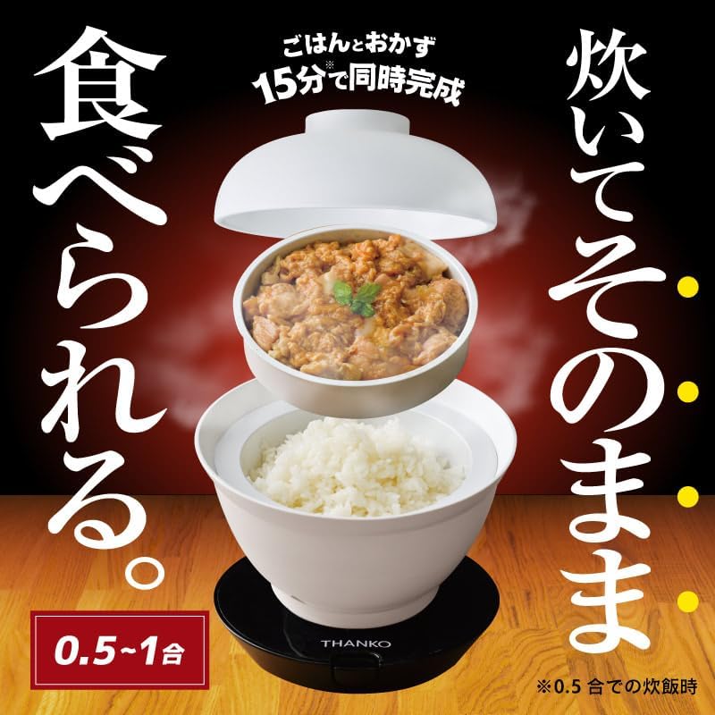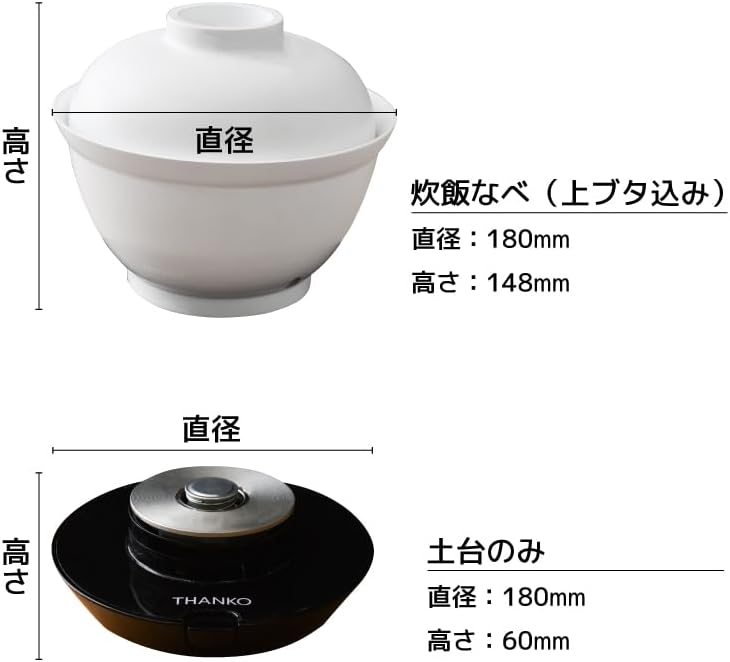 Amazonマーケットプレイス保証は、出品者が販売および発送する商品をご購入の場合に適用されます。Amazonマーケットプレイス保証は、購入された商品のコンディションや配送を保証するものです。 【サイズ】炊飯なべ(上ブタ込み):直径180×高さ148(mm) 土台のみ:直径180×高さ60(mm) 【重量】炊飯なべ:約630g(上ブタ、おかずトレイ、中ブタ含む) 土台のみ:約420g 定格電圧AC100V 【定格電圧】AC100V 【定格周波数】50/60Hz 【定格消費電力】約200W 【炊飯釜容量】330ml 【おかずトレイ容量】300ml 【最大炊飯容量】0.18L(1合) 【炊飯時間】0.5合:約15分 1合:約20分(浸水・蒸らし時間除く) 【材質】炊飯なべ:PP、シリコン、アルミフッ素コーティング 上ブタ・保護キャップ:PP おかずトレイ・中ブタ:スチールフッ素コーティング 土台:PP、PPS、アルミ、スチール 【ケーブル長】約1000mm 【安全装置】サーモスタット・温度ヒューズ・電流ヒューズ 【付属品】上ブタ、おかずトレイ、中ブタ、炊飯なべ、土台、保護キャップ、計量カップ、日本語取扱説明書